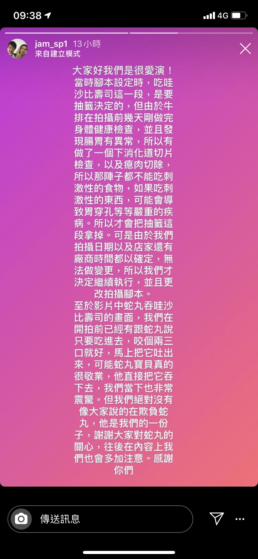 有網友表示,「蛇丸太可憐了吧」、「這一集蛇丸超慘,哇沙米軍艦卷真的吃下去了喔?感覺好恐怖....」、「蛇丸寶貝辛苦你了,為藝術犧牲」,為此狠愛演團隊也在影片留言區以及Instagram限時動態澄清,「原本腳本設定這段是抽籤決定,但由於牛排剛做完身體健康檢查,無法吃刺激性食物,才將抽籤這段拿掉。但拍攝店家與廠商日期都已確定,所以才更改腳本並繼續執行」,同時拍攝前也有跟蛇丸說明「只要吃進去,咬個兩三口就好,馬上把它吐出來」,但蛇丸因為太敬業才會直接吞下去,他們當下也十分震驚!最後狠愛演也強調沒有欺負蛇丸,並表示蛇丸是團隊的一份子,往後會在內容上多加注意。