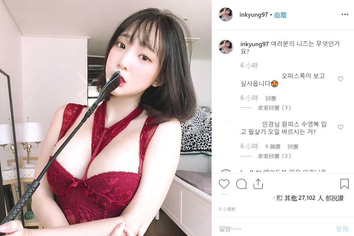 姜仁卿今年只有22歲,在甜美的外貌之下,擁有不科學的傲人上圍。雖然只有160公分,身材相當嬌小,但是她的身材卻相當玲瓏有緻。29日時,恰逢「黑色星期五」,而姜仁卿在個人IG中,特別放送服利,曬出一張火辣自拍照,並詢問:「你有什麼需要」,引起粉絲一陣熱議!照片中,她手拿著皮革馬鞭,一身酒紅色蕾絲內衣,其中亮點在,這件內衣設計非常有巧思,類似吊帶的設計,將姜仁卿傲人的上圍拖住,但在上胸剪裁出一個中空大洞,讓她渾圓飽滿的北半球無所遁形。酒紅色的內衣更襯托出姜仁卿的皮膚相當白皙,照片十分火辣,短短時間立刻獲得2萬7千多人按讚。