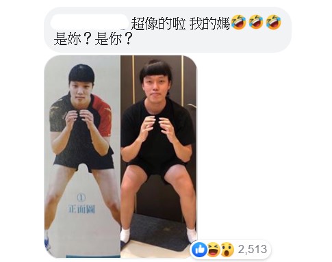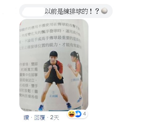 這張照片隨後也在FB上廣為流傳,更有網友將照片貼在胡椒的粉絲專頁下,直呼「以前是練排球的!?」。隨後,胡椒也對此回應,拍出一張模仿打排球的照片,幽默表示「哼~明明就不像」,照片中胡椒將頭髮扮成妹妹頭瀏海,完全是照片中女子的模樣,相似度超高!