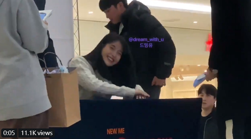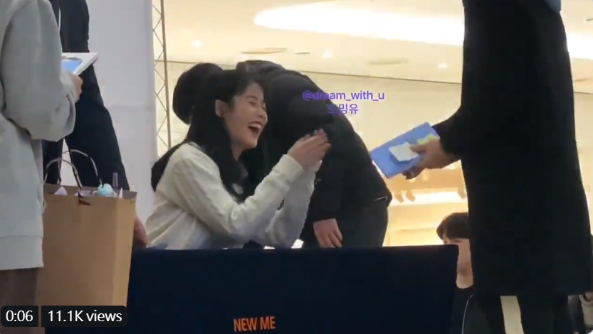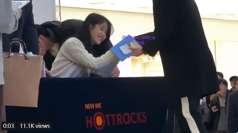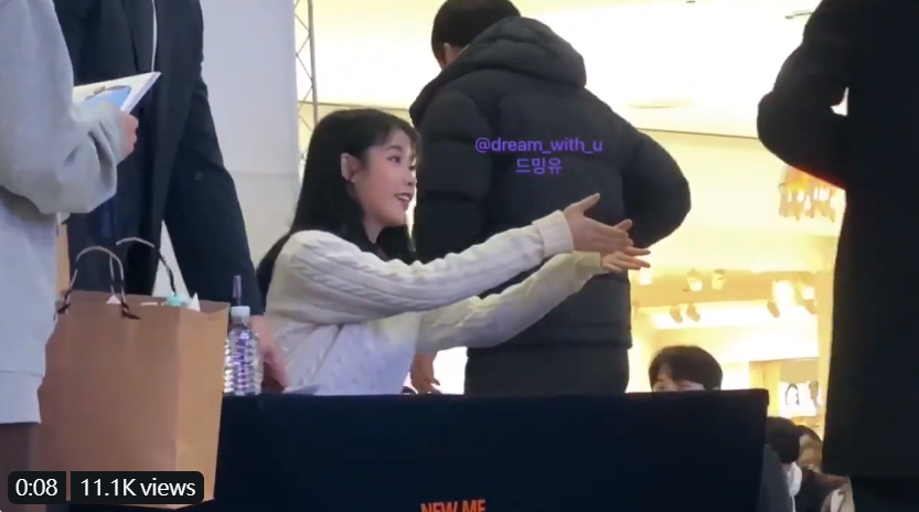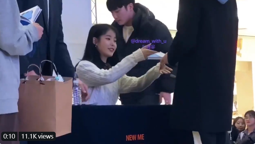 IU為該位男粉絲上台簽完名後,把專輯還給他,同時伸手要和他握手,結果男粉絲準備離去,而IU又再次伸出手,這回男粉絲不知是太緊張還是會錯意,居然給了她一支筆,令IU尷尬笑倒,而一旁保鑣也看不下去,向男粉絲示意是要握手,最後IU才終於和男粉絲握了手,露出燦爛笑容。影片也引起不少網友討論,紛紛大呼:「IU好可愛啊」、「我也好想握手」。