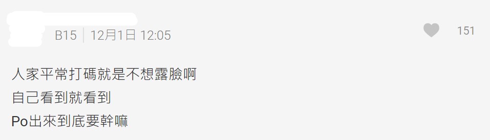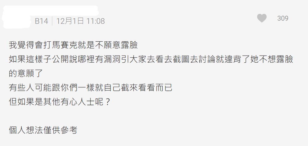 原PO在文末也放出了一張尼克面目的照片,但因為怕造成困擾,因此在她的眼睛塗了白色遮掩。此文一出,也立刻吸引眾多網友關注,有網友對於原PO這則發文公開影片漏洞表示,「我覺得會打馬賽克就是不願意露臉」,因為這篇文章公開了影片漏洞,引大家去截圖反而會造成尼克妹的困擾。但也有部分網友表示,「很早之前就有影片露臉過了,真的蠻漂亮的。」