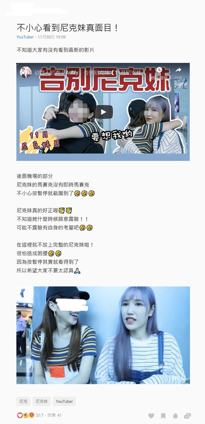 近日,知名論壇Dcard上有網友以「不小心看到尼克妹真面目!」為標題發文,文中表示在「告別尼克妹」的影片中,Ashly與尼克妹在機場的畫面沒有即時馬賽克,讓妹妹的真面目曝光,原PO在文中表示「尼克妹真的好正喔,不知道她什麼時候願意露臉!!可能不露臉有自身考量吧」。