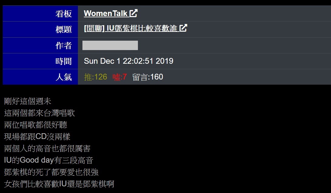PTT問卦「IU、鄧紫棋」二選一!鄉民「全都一面倒」:真的不能比,輸慘!