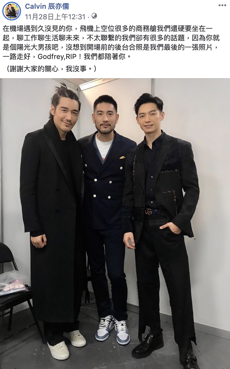 除了陳偉霆之外,辰亦儒也在社群平台上發出錄影前的最後一張合照,並說道:「在機場遇到久沒見的你,飛機上空位很多的商務艙我們還硬要坐在一起,聊工作聊生活聊未來,不太聯繫的我們卻有很多的話題,因為你就是個陽光大男孩吧,沒想到開場前的後台合照是我們最後的一張照片,一路走好,Godfrey,RIP!我們都陪著你。」,高以翔生前在演藝圈中也結交許多好友,真誠溫暖的模樣也深深烙印在大家心中。