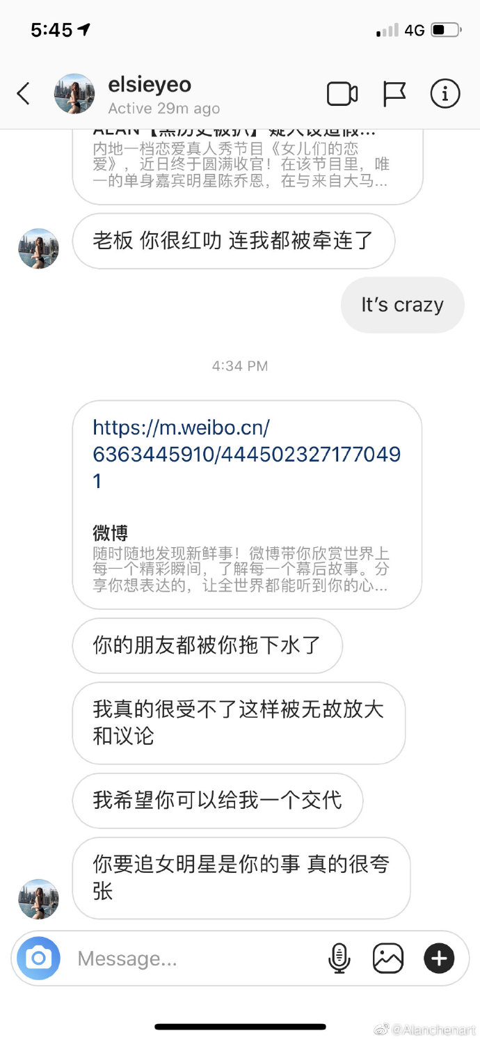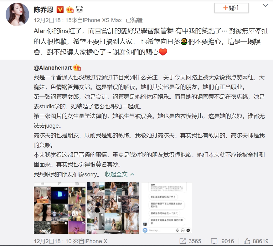 而艾倫事後也在2日發文澄清,他認真的解釋說,追蹤名單的女孩都只是朋友,「我是一個普通人,也沒想過要通過節目受到什麼關注,關於今天網路上被大眾說我點讚網紅,大胸妹,色情鋼管舞女郎,這是錯誤的解讀!她們都是我的朋友,她們也都有正當職業!」,同時也跟他們的朋友們道歉。結果陳喬恩也轉發文章力挺他的解釋,「對被無辜牽扯的人很抱歉,希望不要打擾到人家!也希望向日葵們不要擔心,這只是一場誤會,對不起讓大家擔心了~謝謝你們的關心」。