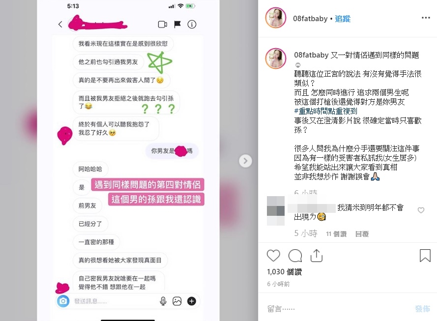 除了米砂說詞有許多疑點以外,阿乃更收到來自「受害者的私訊」,該名網友指出「她以前也勾引過我男友!而且被我男友拒絕之後就跑去勾引孫」同時該網友也提到,米砂手段一模一樣,除了會一直私訊以外,更會直接問男生要不要在一起,接著「拍片拍合照發ig」讓正宮生氣,甚至還會在朋友圈說「XXX跟她在一起」!最後阿乃跟該名網友也發現,米砂其實在同個時間點糾纏兩人的男友,種種行為讓兩人感到十分震驚、無語,因此決定公開,讓大家看清楚真相。