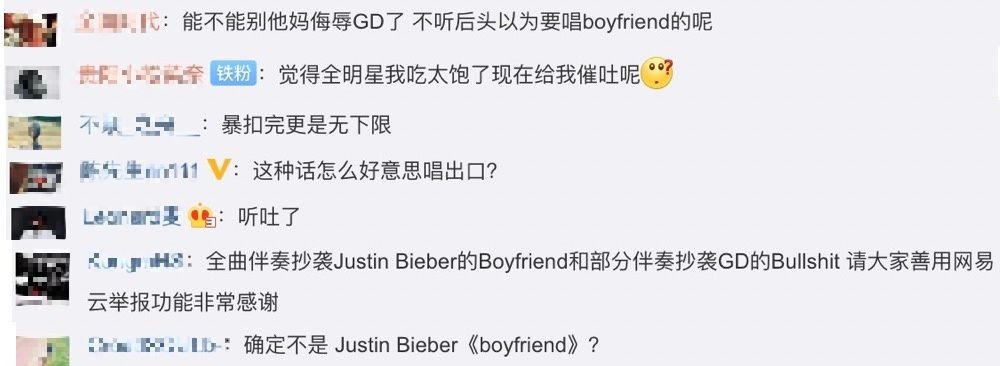 對此網友也傻眼的留言說到:「全曲伴奏抄襲Justin Bieber的Boyfriend和部分伴奏抄襲GD的Bullshit,請大家善用網易雲舉報功能非常感謝」、「聽吐了」、「這種話怎麼好意思唱出口?」、「暴扣完更是無下限」、「觉得全明星我吃太饱了现在给我催吐呢」,對於王浩軒自稱為「中國GD」以及抄襲歌曲感到相當不滿。