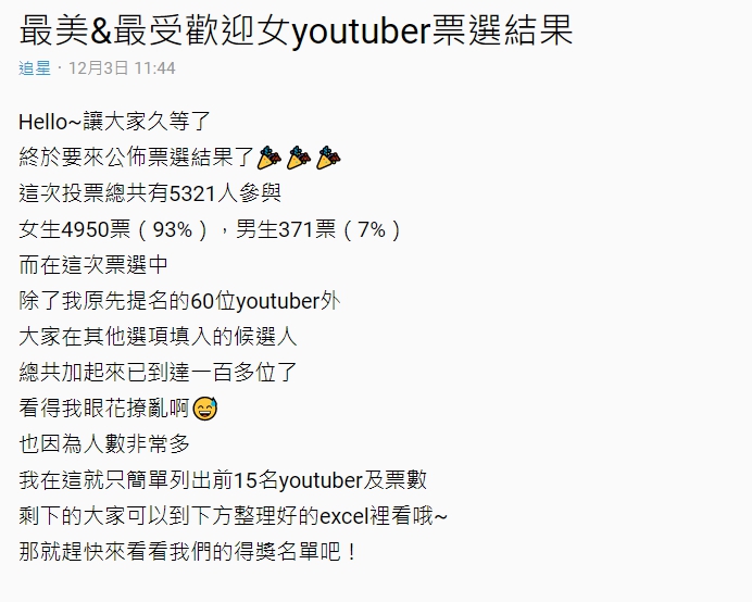 日前有Dcard網友舉辦投票,選出心目中最美以及最受歡迎的女youtuber,今日結果終於出爐!原PO表示這次投票共有5321位網友參與,而選項除了原先提名的60位網紅,後續也加入不少網友填入的候選人,共計有100多位選手參與選拔,最終結果出爐,最美Youtuber前五名分別為「Kelly」、「千千」、「蔡瑞雪」、「蒨蒨」、「Gina」。