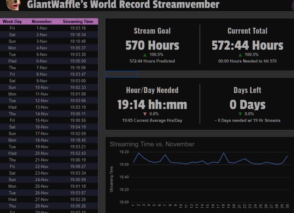 近日,在《遊戲大亂鬪》有網友整理出開台時數超長的四位直播主,第一位是Giantwaffle,這位外國實況主 於上個月起挑戰進行一個月直播 570 小時遊戲實況企劃,日前他確定達成了這個世界紀錄,總共直播了 572 個小時。在這 30 天內,GiantWaffle 每天都要直播 19 個小時,平均一天只睡約 3.5 小時,並且在過程中遊玩了多款遊戲大作包含了《死亡擱淺》、《異星工廠(Factorio)》、《虹彩六號:圍攻行動》等。在這個月不停歇的直播,給他帶來了 3 百萬小時的觀看以及 1 萬以上的訂閱數。