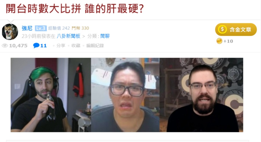 在網路時代的進步,網路平台給了許多素人成名的機會,許多直播平台的興起,也為直播主們創造了許多工作機會,許多直播主為了流量發揮出各種創意,直播種類也各式各樣如吃播、探險直播、遊戲直播、唱歌、跳舞等。近日,知名論壇《遊戲大亂鬪》有網友整理了直播主「開台時數大比拼,誰的肝最硬?」的文章,引起了網友熱烈討論。