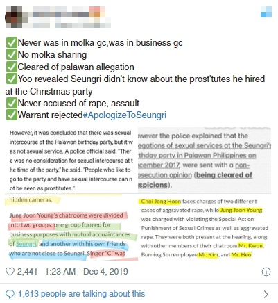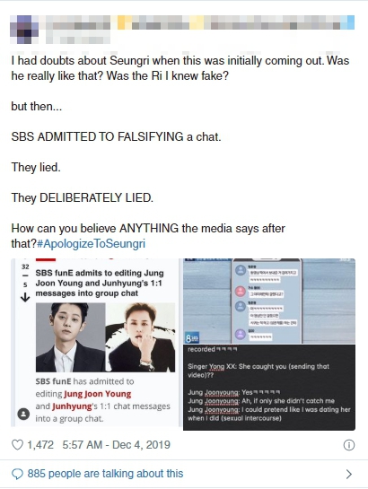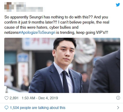 在粉絲的舉例下,他們決定發起在推特發起「 #ApologizeToSeungri 」,要求媒體向勝利道歉,並宣稱勝利其實是無辜的。不過也有網友認為,雖然勝利並不在聊天室中,但並非代表,他就真的對所有的事情一無所知。近期,警方目前正在針對勝利的賭博事件進行調查。