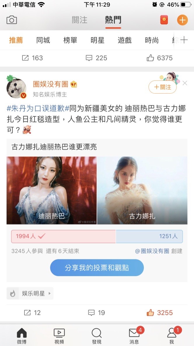 除此之外也有網友為如今人氣極高的迪麗熱巴和古力娜扎開投票,徵求網友意見「同為新疆美女的迪麗熱巴和古力娜扎紅毯造型,人魚公主和凡間精靈,你覺得誰更可?」,目前為止迪麗熱巴1994票對比古力娜扎的1251票,略勝一籌。