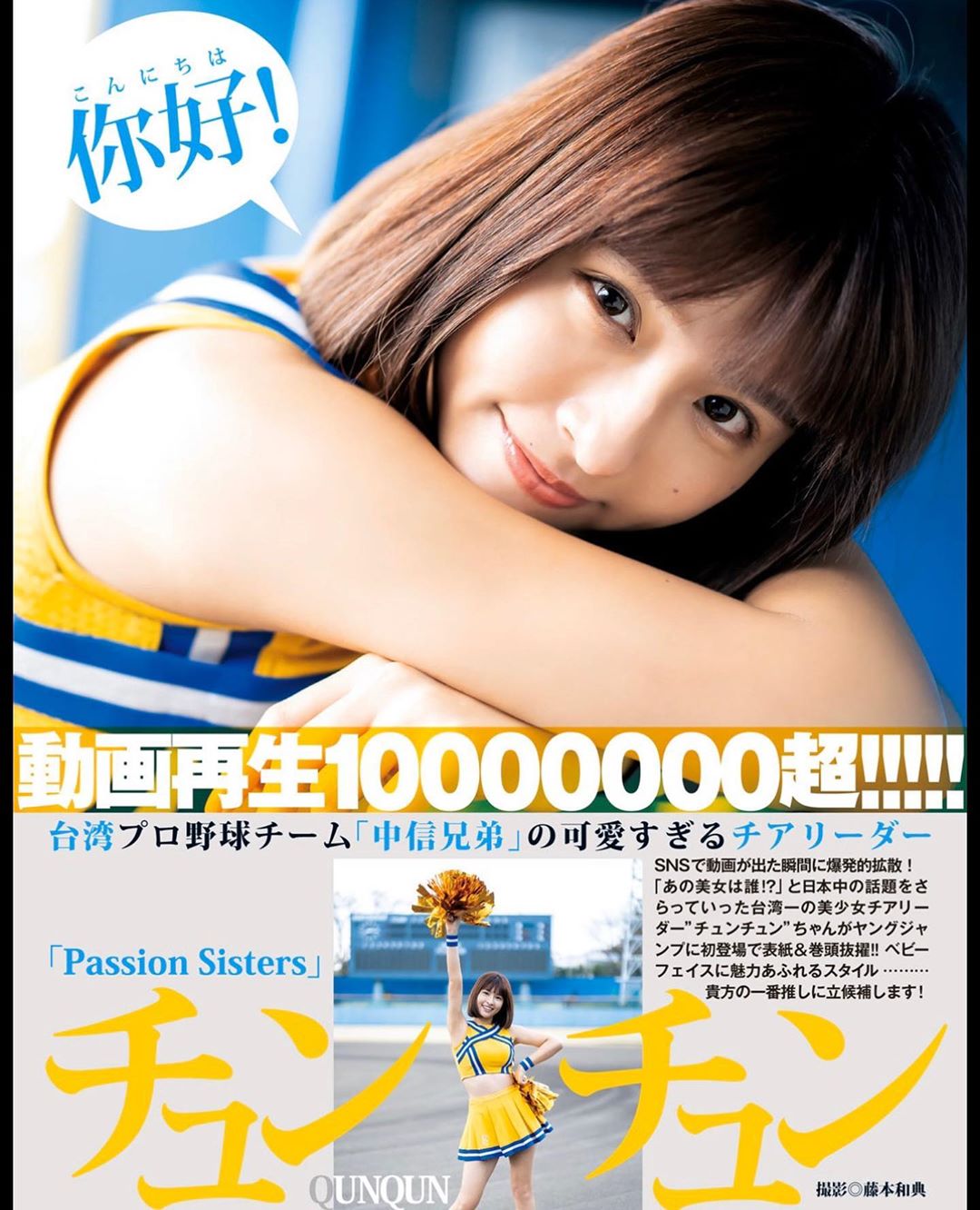 更厲害的是,峮峮登上日本雜誌《週刊YOUNG JUMP》,還被稱為是「台灣第一的啦啦隊美少女」!在封面上穿著中信兄弟象的亮黃色啦啦隊服,看起來可是活力十足,青春無極限呢!而且峮峮自己也表示,「很高興受到集英社邀請,拍攝日本漫畫週刊YOUNG JUMP 12月5日的封面,據說是歷史悠久的週刊,超酷!」