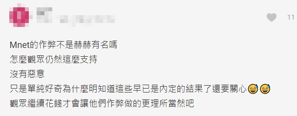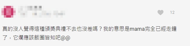 除此之外,也有許多網友認為MAMA近年來,已經逐漸喪失公信力,時常傳出「內定」的消息,只要有出席典禮就會得獎,頻頻被觀眾詬病。讓許多粉絲不滿痛批:「Mnet的作弊不是赫赫有名嗎?怎麼觀眾仍然這麼支持」、「真的沒人覺得這種頒獎典禮不去也沒差嗎?我的意思是mama完全已經走鐘了,它爛應該飯圈皆知吧」,更有粉絲直接調侃:「讓我們先恭喜以上得獎者(?」,不過還是有許多網友緩頰表示:「看表演就好」。