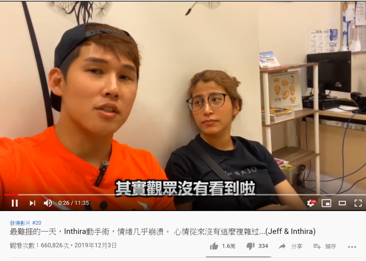 知名百萬Youtube頻道「Jeff & Inthira」,是由一對大馬情侶一同經營的Youtube頻道,影片以兩人互動日常以及社會實驗為主題,因兩人之間反應真實、不做作又搞笑,獲得了許多網友的青睞,頻道訂閱有100萬訂閱人數。近日,在新影片當中Inthira因為子宮長了血瘤,聽從醫生的建議後決定要動手術,Jeff也將過程拍成影片,讓許多粉絲紛紛送上祝福表示「早日康復」。