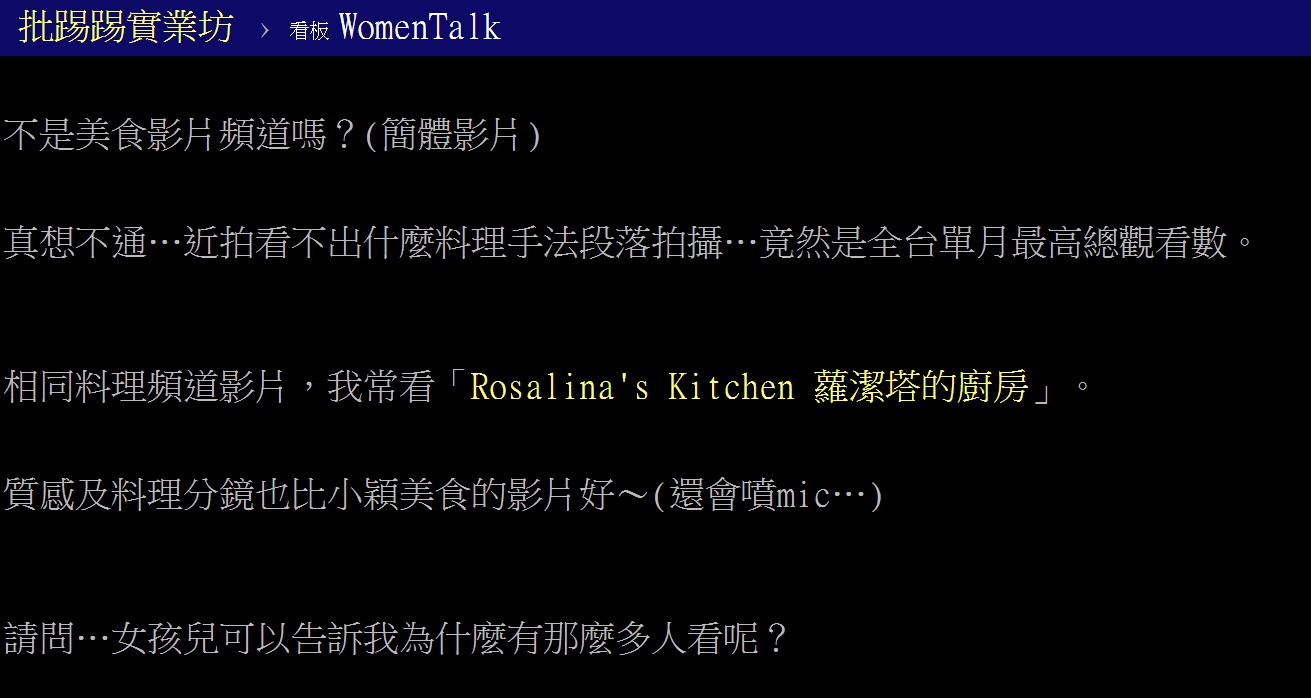 有網友日前在PTT上PO出一張「統計近30天觀看量前40的YouTuber」表格,只見排行第一的是名叫「小穎美食」的YouTuber,該網友疑惑表示「不是美食影片頻道嗎?真想不通…近拍看不出什麼料理手法段落拍攝…竟然是全台單月最高總觀看數。」透露自己最常看的類似頻道,質感、料理分鏡也比小穎美食好,因此想詢問廣大網友「為甚麼有那麼多人看?」