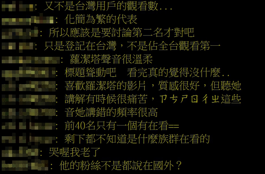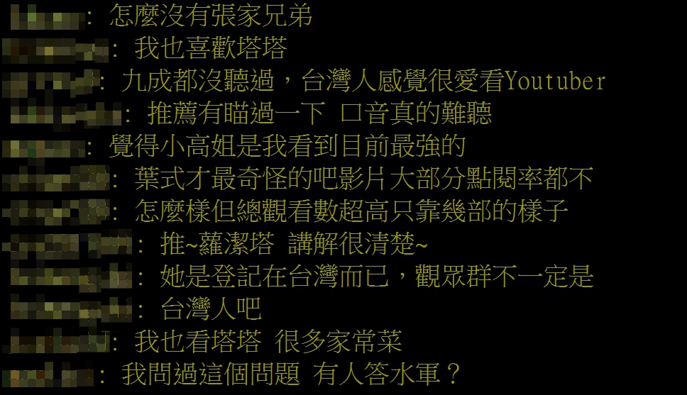 這則文章一出,立刻引起大批網友熱議,大家紛紛留言討論「誰?」、「怎麼沒有張家兄弟」、「九成都沒聽過,台灣人感覺很愛看Youtuber」、「我問過這個問題,有人答水軍?」、「標題聳動吧,看完真的覺得沒什麼..」、「前40名只有一個有在看」、「又不是台灣用戶的觀看數...」。