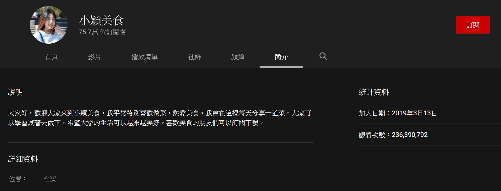 「小穎美食」頻道登記在台灣,雖然在台似乎知名度不高,但自從今年3月開設頻道以來,累積觀看數已有兩億三千多萬,熱門影片觀看數破一千多萬觀看人次的也有許多支,流量十分驚人。而該YouTuber頻道簡介也寫道「平常特別喜歡做菜,熱愛美食。我會在這裡每天分享一道菜,大家可以學習試著去做下,希望大家的生活可以越來越美好。」
