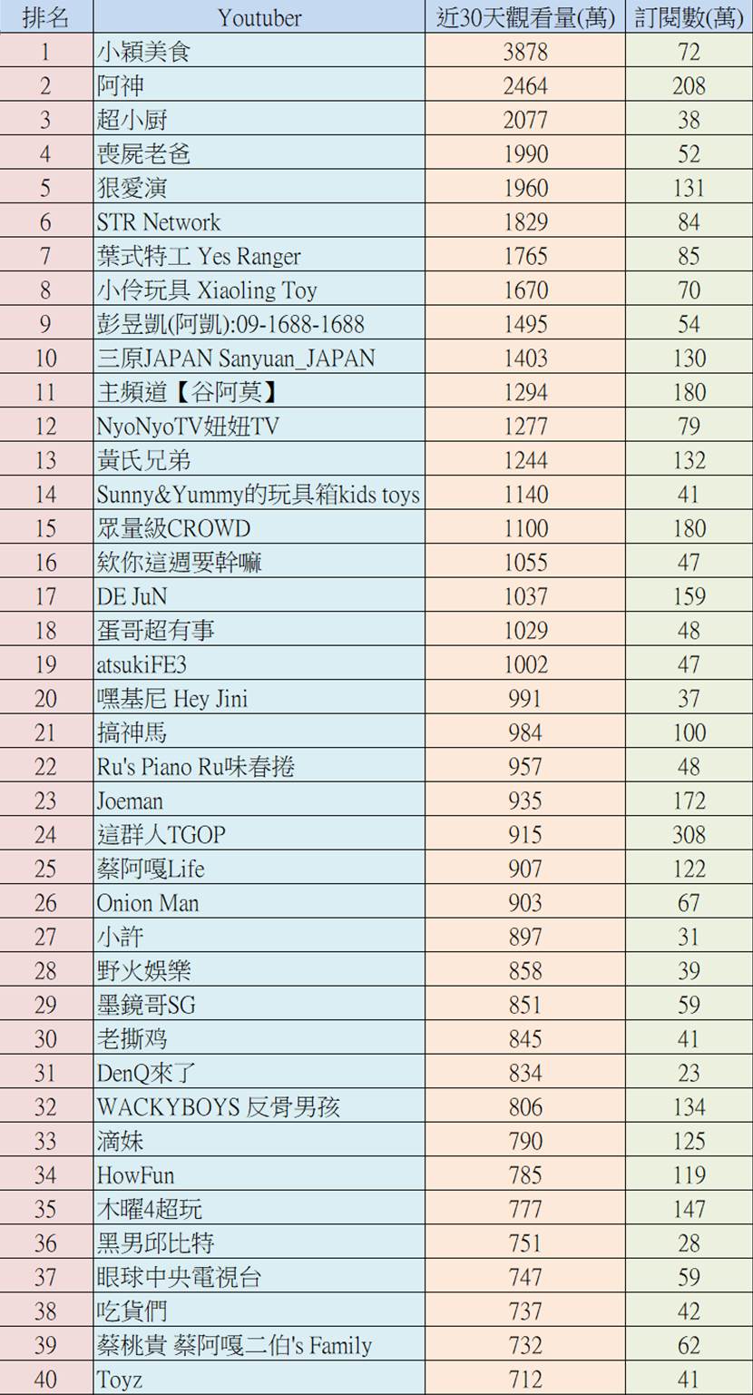 YouTuber是近年來大幅興起的新興行業,高收入與討論度讓該行業受到的關注愈來愈多,許多人開始心生嚮往,進而投入這項領域,競爭也愈來愈激烈。近來有網友透過統計網站,在PTT分享了一張圖片,內容為「近30天觀看量前四十的YouTube頻道」,意外引起熱議。