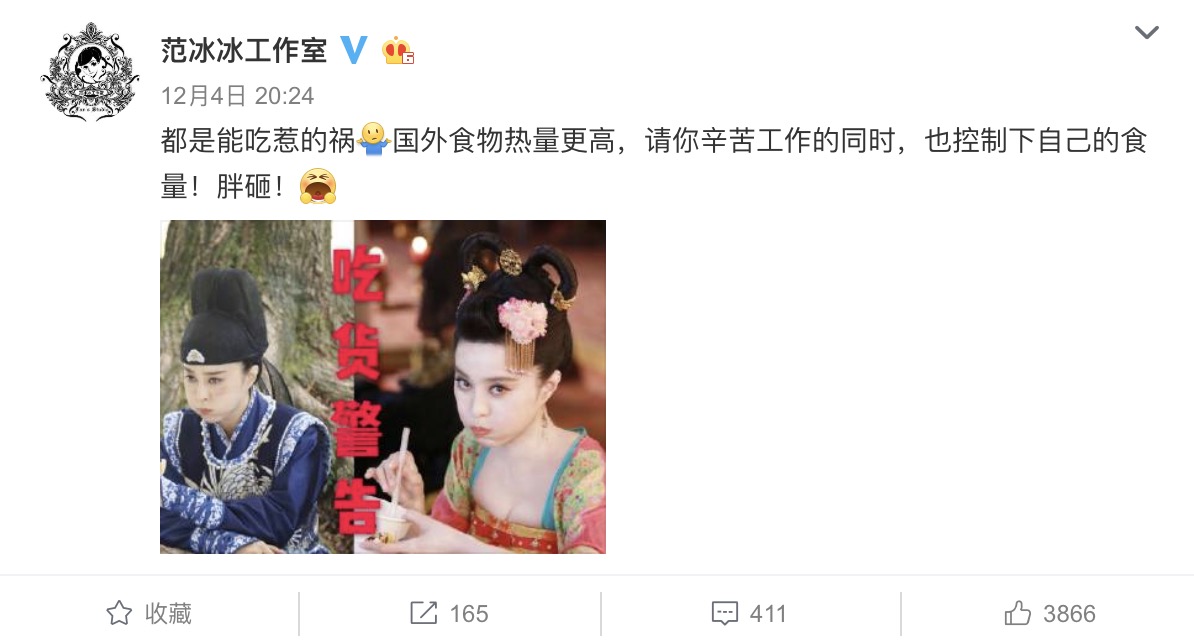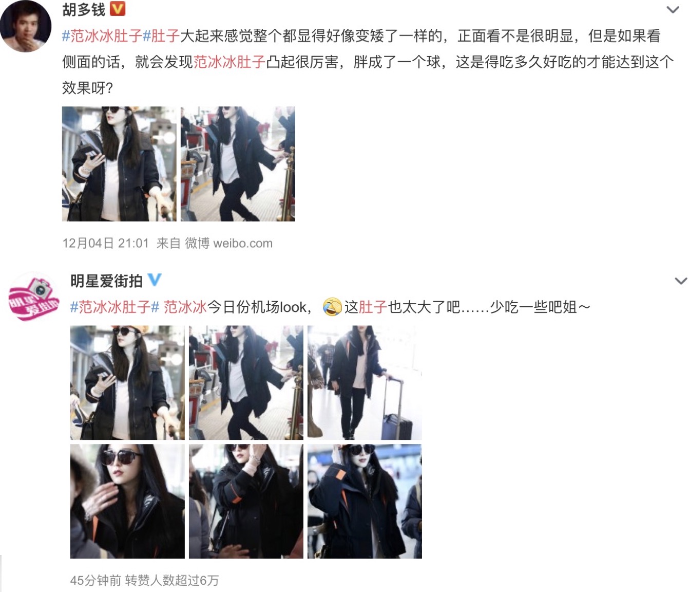 時隔近6個月後范冰冰4號現身北京機場時被捕捉,照片中范冰冰的肚子似乎有些凸出,當她邁步向前時肚子的曲線相當明顯,和過往纖細平坦的模樣相差許多,對此許多博主也紛紛吐槽:「這肚子也太大了吧……少吃一些吧姐~」、「但是如果看側面的話,就會發現範冰冰肚子凸起很厲害」,范冰冰的凸肚照也在微博上瘋傳更登上微博熱搜榜中,對此范冰冰工作室也回應:「都是能吃惹的禍,國外食物熱量更高,請你辛苦工作的同時,也控制下自己的食量」。