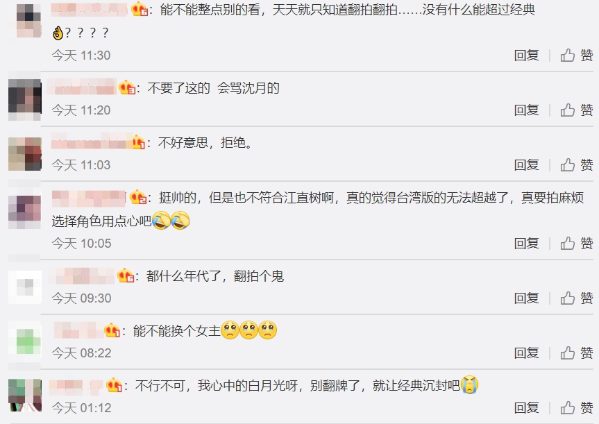 經典一再被翻拍,不同形象的「江直樹」與「袁湘琴」也引起網友正反兩極的評價,許多網友紛紛表示「可能翻拍的意義是讓我更喜歡經典吧」、「能不能整點別的看,天天就只知道翻拍翻拍……沒有什麼能超過經典????」、「不好意思,拒絕。」、「挺帥的,但是也不符合江直樹啊,真的覺得臺灣版的無法超越了,真要拍麻煩選擇角色用點心吧」、「不行不可,我心中的白月光呀,別翻拍了,就讓經典沉封吧」,但也有少數網友表示支持翻拍。