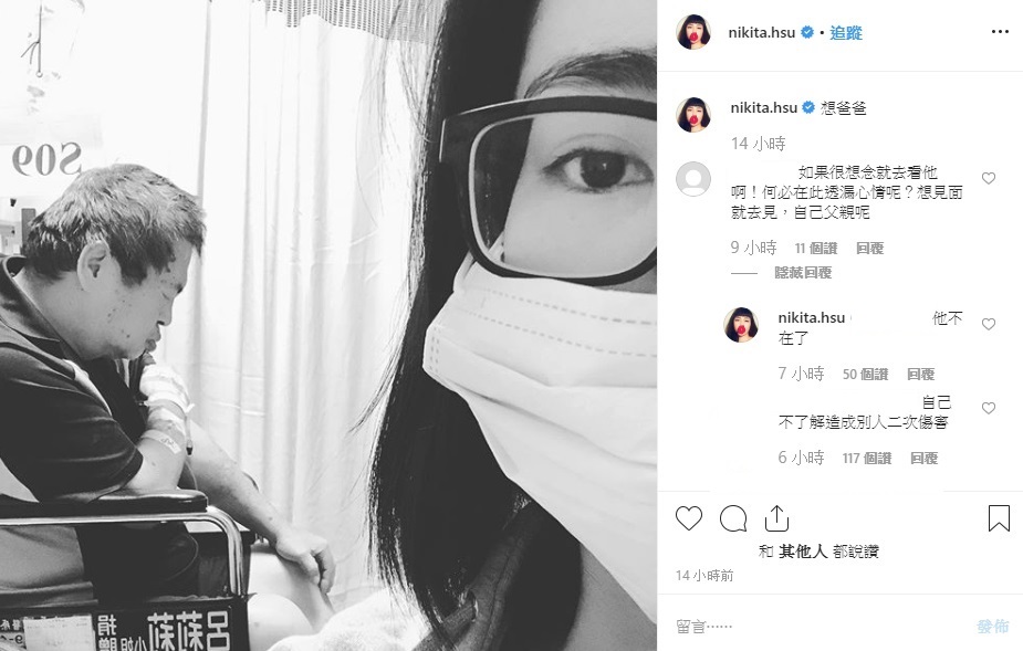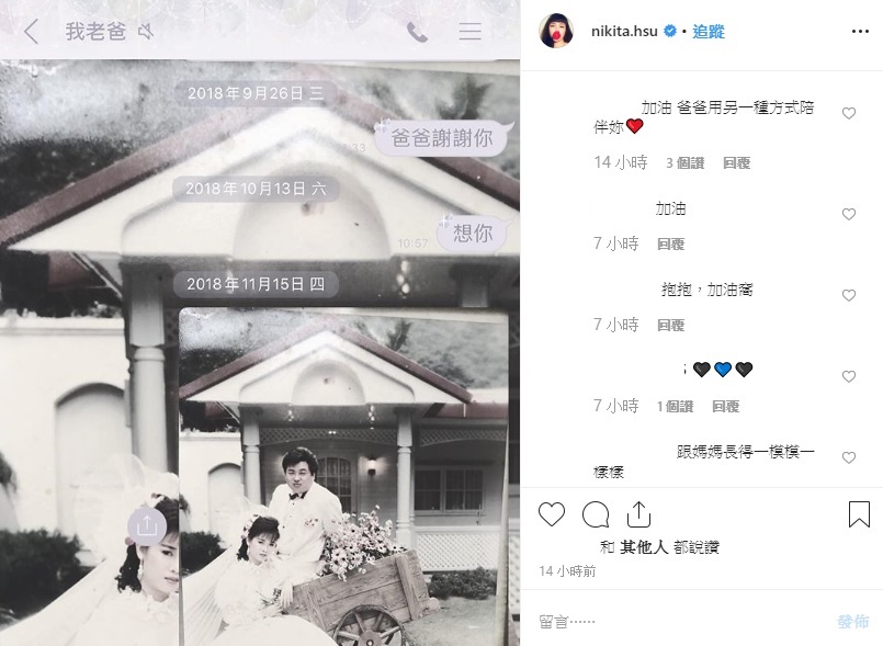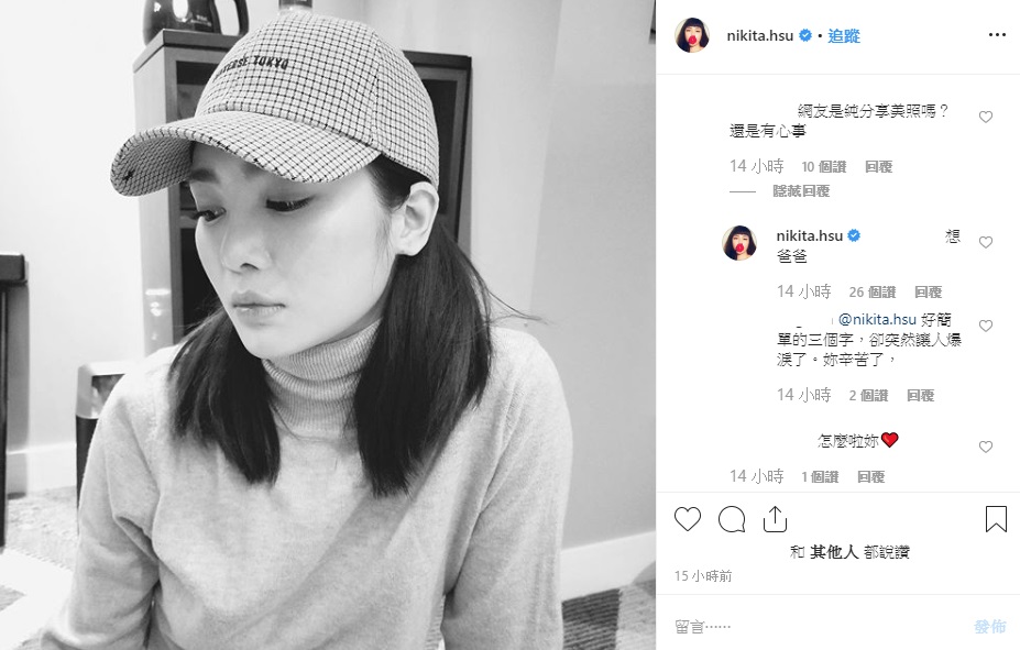 也有不少人看完這一系列的黑白照之後,都紛紛在最後一張留言給Nikita,希望可以鼓勵她,「想念爸爸可以,但絕不要讓自己長時間陷入憂鬱哦!」、「我們都要記得愛要及時,擦乾眼淚後還是要繼續加油!」、「下輩子會再跟爸爸相遇的」、「干巴爹!」、「爸爸一定都知道你在想他」,讓不少人也都跟著思念起自己的家人。