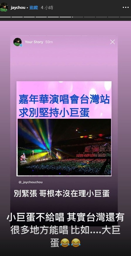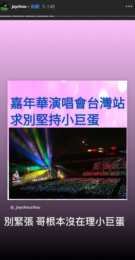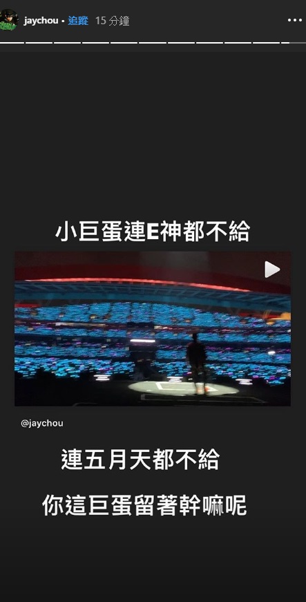 周杰倫5日在IG上發了限時動態跟貼文,隔空嗆聲小巨蛋,他內容寫道,「哥說實在,IG從不PO不愉快的事,這個反正過一陣就刪了!哈哈~#台北小巨蛋」,並且附上幾張照片,從照片中的文字可以得知,「小巨蛋連E神都不給唱,連五月天也不給唱,你這巨蛋留著幹嘛呢?」