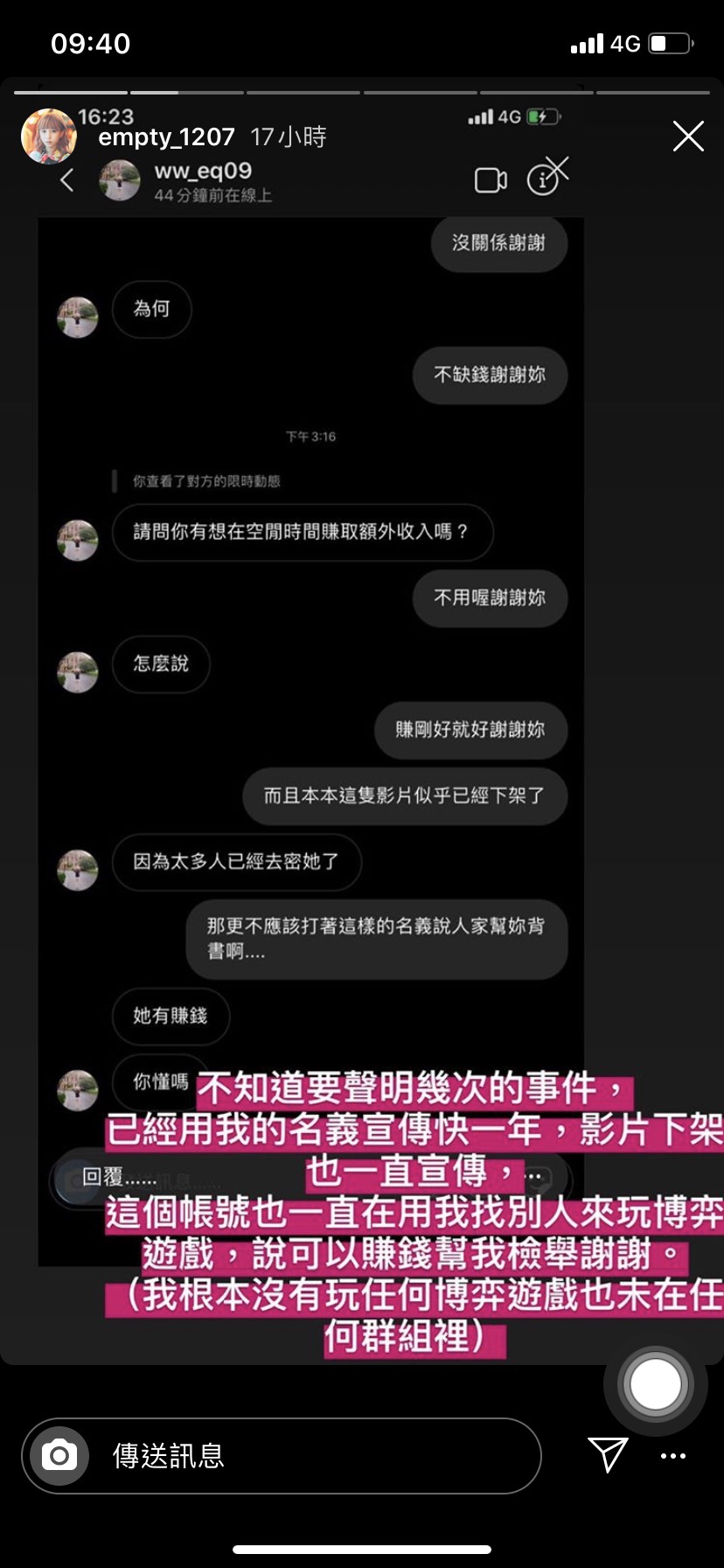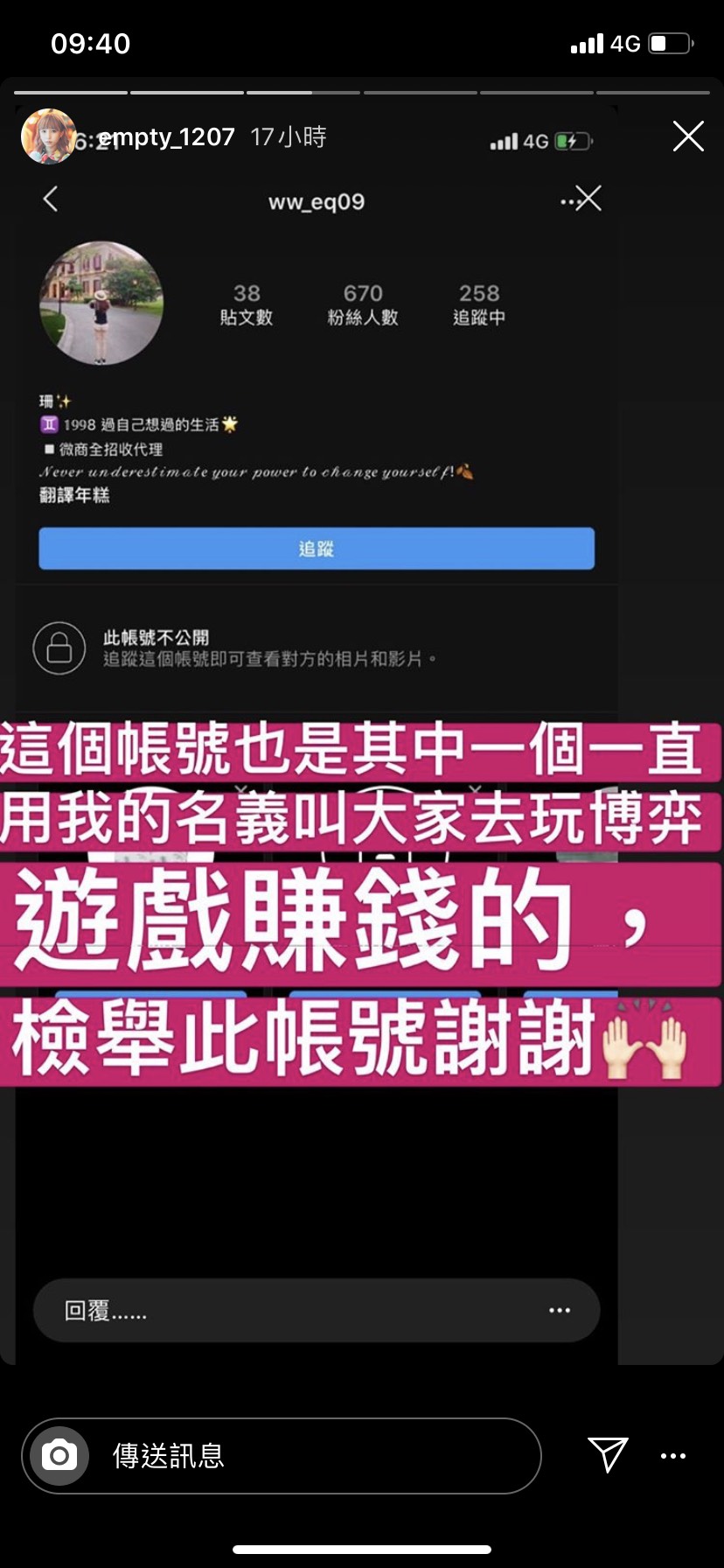 本本得知後,爆氣在限時裡寫道,「這個帳號一直在用我找別人來玩博弈遊戲,說可以賺錢,幫我檢舉謝謝。」同時透露這已經不是第一次「不知道要聲明幾次的事件,已經用我的名義宣傳快一年,影片下架也一直宣傳」。她也再度強調「我根本沒有玩任何博弈遊戲也未在任何群組裡」,隨後她也曬出另一支帳號表示,「這個帳號也是其中一個一直用我的名義叫大家去玩博弈遊戲賺錢的,檢舉此帳號謝謝。」呼籲網友別輕易上當受騙。