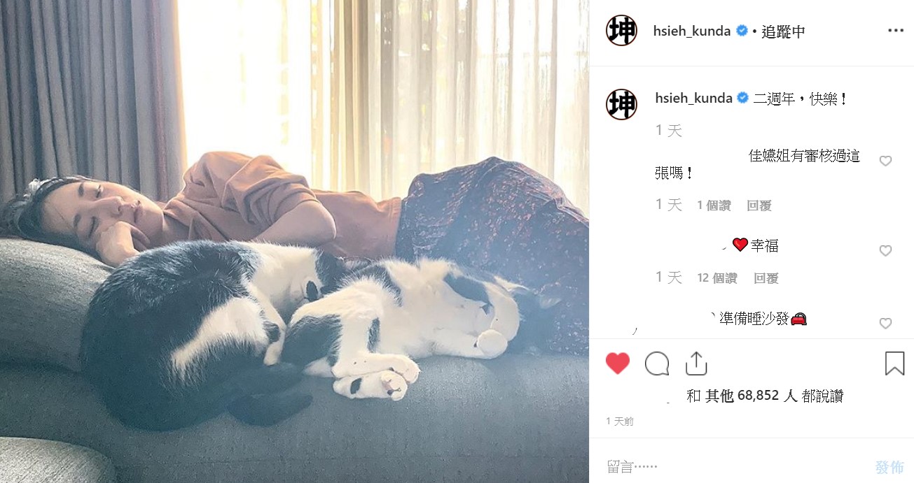 藝人柯佳嬿與坤戀情長跑五年,在前年底宣布結婚喜訊,並於去年9月甜蜜補辦婚宴,向來都保持低調的兩人,婚後卻越愛越高調,升格為「謝太太」的柯佳嬿,更是在結婚之後連發「老公視角」的照片秀恩愛!最近,坤達也在IG曬出老婆與兩隻毛小孩躺在沙發上睡覺的照片,甜蜜的說「二週年,快樂!」沒想到,卻讓粉絲們紛紛替柯佳嬿問說,「這照片,老婆大人是可以的嗎?」