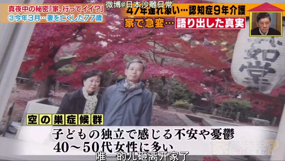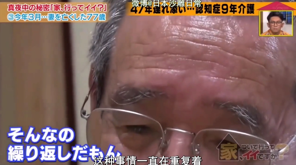 內藤先生透露,老婆在9年前得了老人癡呆症:「據說是『空巢症候群』引發的,因為唯一的兒子離開家了」,老婆開始會不斷問同一件事情,還迷路了兩次、把家裡翻箱倒櫃弄得亂七八糟,卻沒辦法把東西收拾回去,「一不注意可能發生危險,得時刻盯著,還很不聽話」,內藤先生親自照顧老婆,然而長久以來的壓力使他也崩潰了幾次,他坦承:「不是常有照顧老伴太累了就把他殺了的新聞嗎?我也勒過她好幾次脖子」,但每次都在最後關頭住手,「這種事不斷重複,苦啊」。2年前老婆又被發現罹患乳癌,無法吃東西,只能從鼻子灌流質食物,醫生說「不能補充體力,只能聽天由命了」,內藤先生看著夫妻倆在醫院裡的合照,難過透露:「明明1月還很精神,怎麼會在3月就走了」。