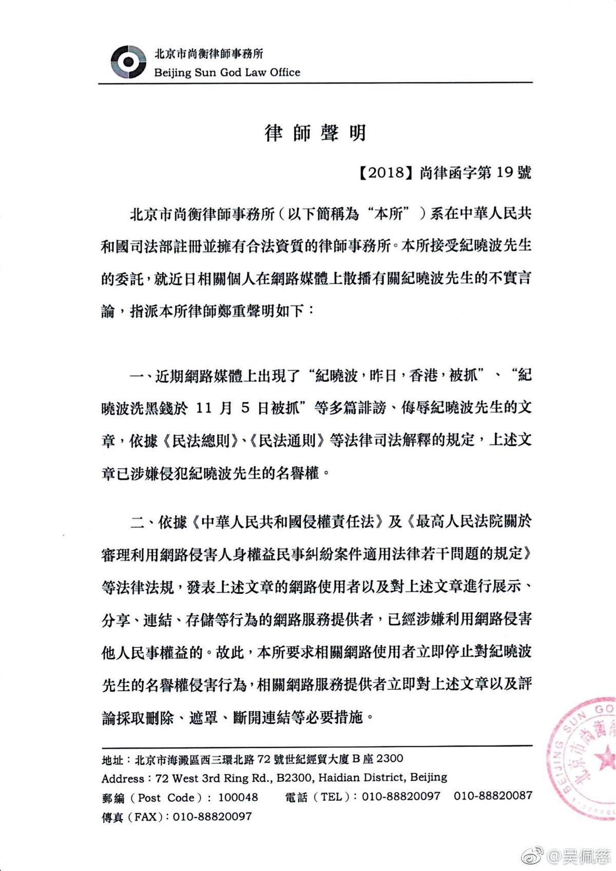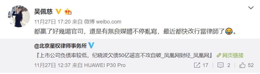 對此傳言,吳佩慈神隱數天後,不打算繼續忍耐惡意傳言下去,以半嘲諷半威脅的語氣,在微博上「警告」媒體不要再亂講話:「都贏了好幾場官司,還是有無良媒體不停亂寫,最近都快改行當律師了」她並轉發「北京星權律師事務所」的微博貼文,引用中國大陸鳳凰網報導,內文聲明之前造謠紀曉波「被抓」、「洗錢」的網友已被告且道歉,且欠債250億元說法也是錯的;報導中指出「其中九十多億元債務是崔麗杰女士及家族投入公司的永續債權,度假村已獲國際融資;對外債務約一百五十多億元,為正常的公司營運負債。」文中強調,「一百五十多億元負債,對市值約630億元的上市公司而言,負債率低,體質優良。」看來吳佩慈的貴婦炫富人生,還能繼續維持下去。