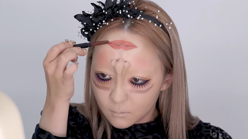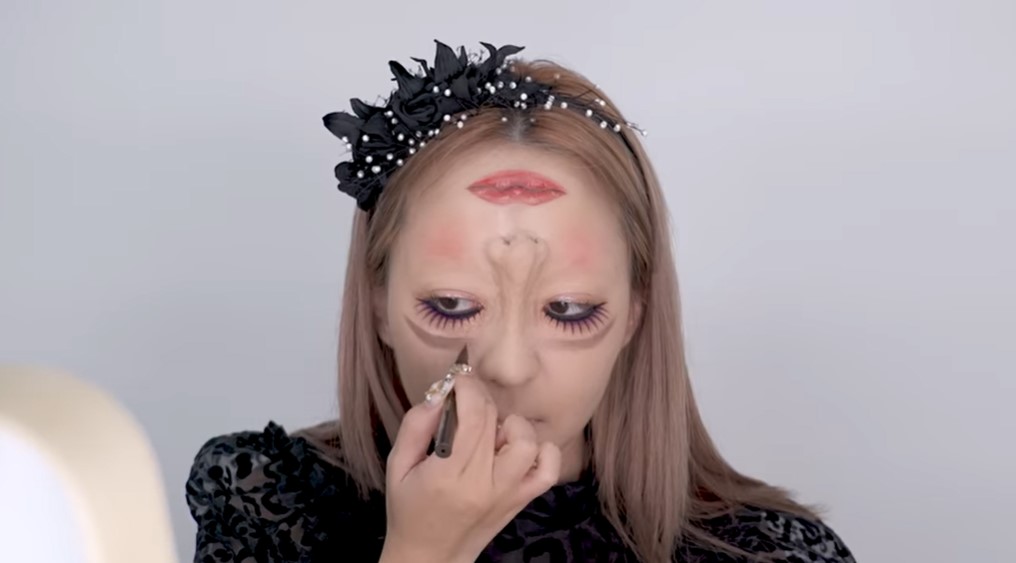 隨後根據眼睛的比例,在下方畫出顛倒的眉毛,以及將眼妝精緻化出顛倒模樣,拿出假睫毛貼在下眼皮處,就算是顛倒妝容還是擁有著水汪汪的大眼,使用眼線筆描出嘴唇形狀,再拿淺色唇釉將嘴唇塗滿,最後用眼線筆將唇形描出,只見她完妝之後,五官全部顛倒,整顆頭像旋轉了180度一樣。