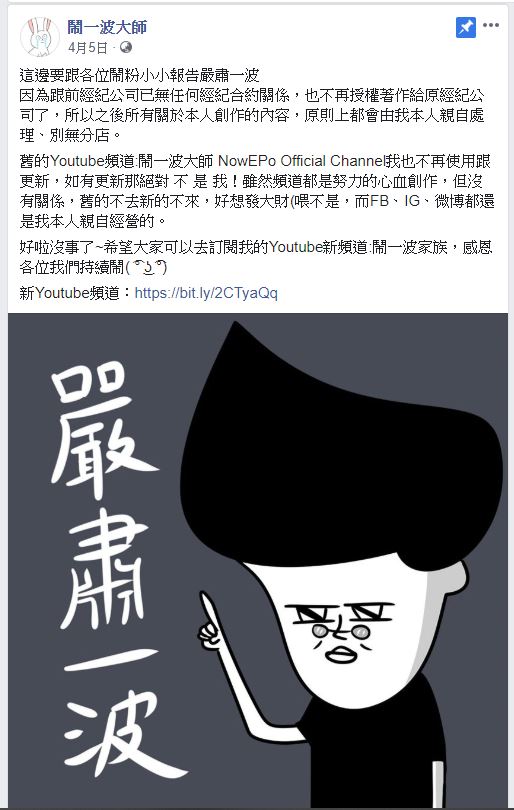「鬧一波」過去以臉書做為發表圖文插畫的平台,自2013年創作至今,已經在臉書上累積了一百四十萬的粉絲人次,而在今年四月初時,「鬧一波」本人則在臉書上發文表示「和前經紀公司解約了」,文中「鬧一波」嚴正申明「舊的Youtube頻道:鬧一波大師 NowEPo Official Channel我也不再使用跟更新,如有更新那絕對不是我!」,儘管言語中帶著許多的不捨,但「鬧一波」仍舊充滿希望地展開了新的開始,更期盼粉絲持續支持他的新頻道和創作。