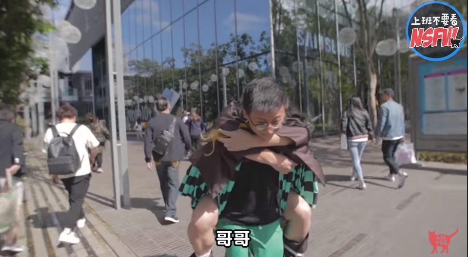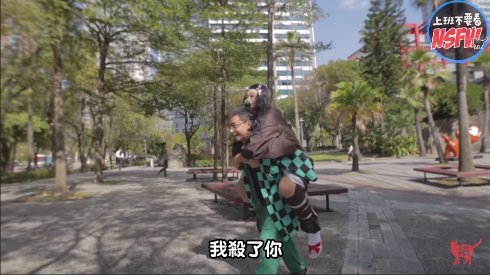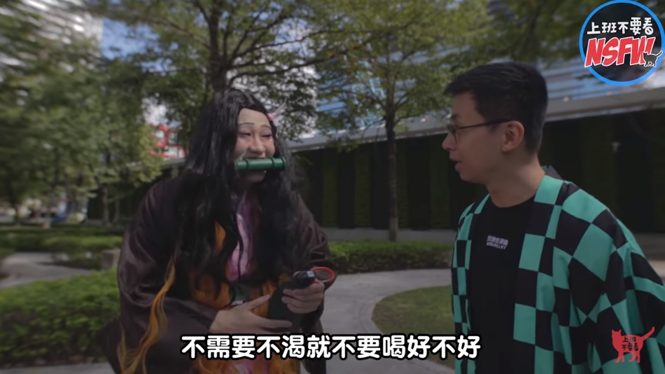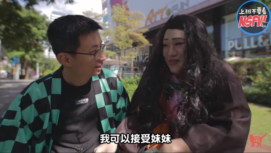 Joeman也把客串「上班不要看」新影片的花絮照貼到Instagram上,配文寫道「『哥哥,我想吃肉!』40歲的哥哥與30歲的妹妹,溫馨!今年最高恥力挑戰就獻給上班不要看特別企劃了。」照片中的他被呱吉抱在懷裡,他頭戴黑色長假髮,臉上畫著超誇張妝容,同時還穿著「禰豆子」角色女裝及短褲,超壯大腿讓人無法忽視;背後的呱吉則穿著一身綠色系的衣服。相較呱吉臉上「懷疑人生」的表情,Joeman正張大嘴巴燦笑,強烈對比讓人不禁捧腹。