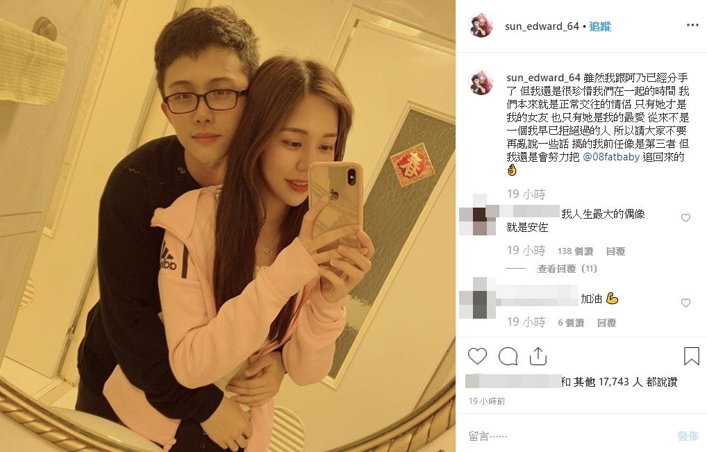 而事件的男主角「孫安佐」也罕見出聲「護愛」,他貼出一張背後環抱的閃照,並表示雖然跟阿乃已經分手,但仍十分珍惜在一起的時光,「我還是會努力把阿乃追回來的!」另外孫安佐也提到,「只有阿乃才是我的女友,也只有她是我的最愛,從來不是一個我早已拒絕過的人!」請大家不要將阿乃認成「第三者」,護愛舉動獲得許多粉絲讚賞。