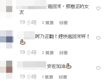 孫安佐文章一出,立刻引來許多網友按讚,同時也有人留言表示,「我人生最大的偶像就是安佐」、「支持你,要加油喔」、「阿乃正翻!趕快追回來呀」、「互相覺得都是對的人,就要好好把握」。不過仍有許多人不看好,留言狂酸「沒人說阿乃是第三者,是你劈兩個」、「misa的小孩表示爸爸我好冷」、「只有我覺得分手後把親密照潑出來,還在這麼多人眼前放話要追回來,對對方很不尊重和很造成困擾嗎?」