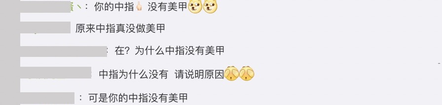 在本月3號時,腐團兒在微博上曬出一組性感的照片,畫面中她戴上了淺紫色的假髮,長度超過了腰間,而當天她僅穿了一件白色的襯衫就跪坐在沙發上,除了露出一雙纖細白皙的長腿外,更將上衣領口打開,露出大片胸上區域,其中一張更是不小心露出半球的曲線,姿勢與服裝都相當撩人。然而就有眼尖的網友發現腐團兒雙手都有進行指甲彩繪,唯獨只有中指是留空的,保留著原本指甲的模樣,此舉也引起網友熱烈討論:「可是你的中指沒有美甲」、「中指為什麼沒有 請說明原因」、「你的中指沒有美甲」,大家也歪樓開始討論起原因。