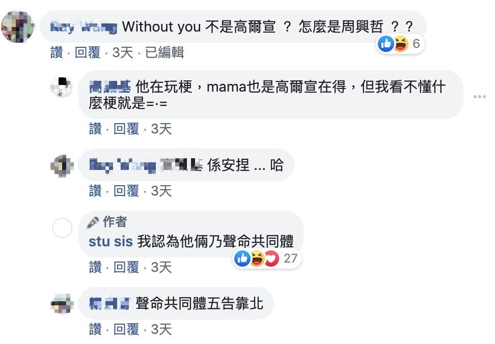 而stu sis更將榜單的第1名與第2名名字調換,對此就有網友在底下詢問原因,也釣出stu sis本人回應:「我認為他倆乃聲命共同體」,意指兩人的曲風以及歌路都十分相似。