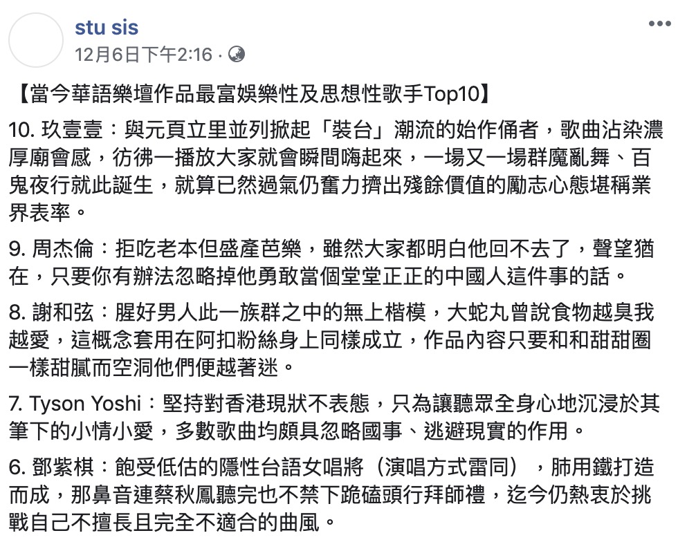 stu sis時常針對現今樂壇做出犀利的點評,在6號時他寫下一篇關於「當今華語樂壇作品最富娛樂性及思想性歌手Top10」的名單,並針對前10名一一進行點評和分析,第10名到第6名依序為:玖壹壹、周杰倫、謝和弦、Tyson Yoshi以及鄧紫棋,其中stu sis在點評台灣天王周杰倫時也毫不留情的說道:「拒吃老本但盛產芭樂,雖然大家都明白他回不去了,聲望猶在」,意指近期周杰倫的作品風格越來越芭樂,而對於鄧紫棋他也給予「飽受低估的隱性台語女唱將」的封號,暗示鄧紫棋和台語歌后蔡秋鳳的演唱方式很雷同。