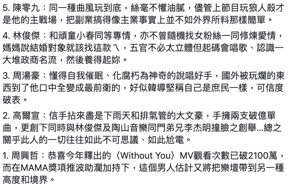 而在第5名到第1名分別為:陳零九、林俊傑、周湯豪、高爾宣以及周湯豪,其中獲得第5名的陳零九被點評為:「同一種曲風玩到底,絲毫不懼油膩,儘管上節目玩狼人殺才是他的主戰場」,對此陳零九本人也在該篇帖文下方回應:「這把我是預言家,先丟你個查殺,我的主業是德州撲克,過」,以幽默的方式回應stu sis的評論。而第4名的林俊傑過去也曾被傳出關於私生活的黑歷史,也因此被評為「和頑童小春同等專情,亦不曾隨機找女粉絲一同修煉愛情」,充滿諷刺卻帶有幽默的點評深受許多網友喜愛,更有人在留言區中說道:「這就叫罵人不帶髒字吧」,獲得熱烈的迴響。