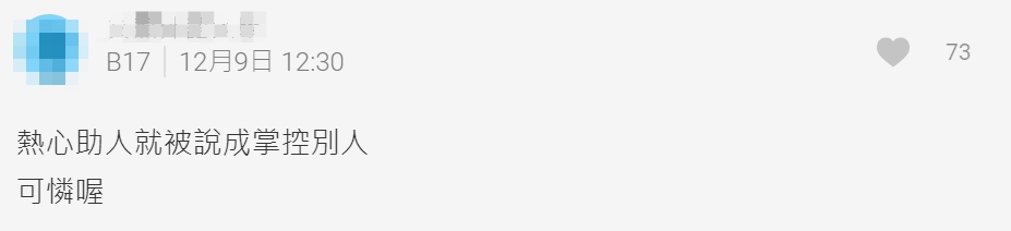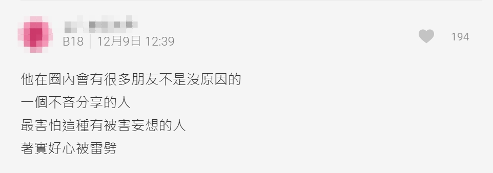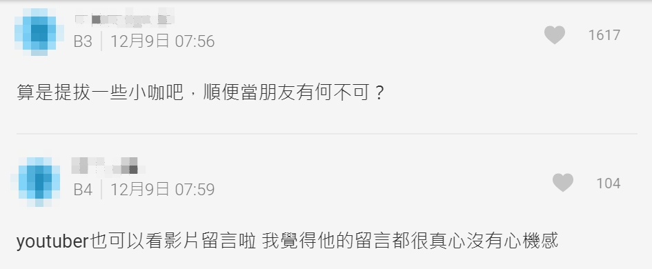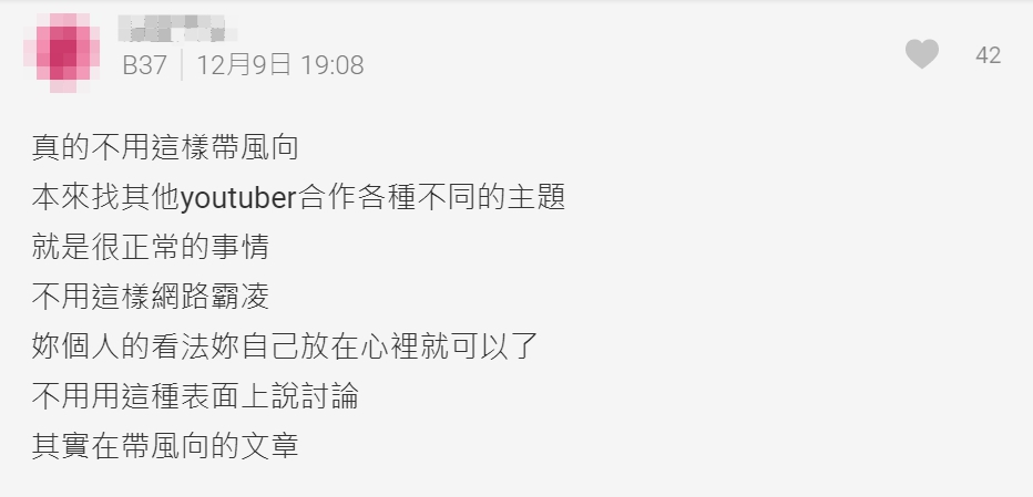 該篇文章引起熱烈討論,然而大部分網友卻對原PO的觀點表示質疑,紛紛留言,「可不可以不要發這種感覺帶風向的文啊,人家單純喜歡去喜歡的頻道下面留言支持被妳扭曲的好像別有居心一樣...」、「留個言,也可以被你曲解成這樣,也是挺厲害的啦」、「他在圈內會有很多朋友不是沒原因的,一個不吝分享的人,最害怕這種有被害妄想的人,著實好心被雷劈」、「自己不善良不代表全世界都跟你一樣啊」、「真的不用這樣帶風向,本來找其他youtuber合作各種不同的主題,就是很正常的事情」。
