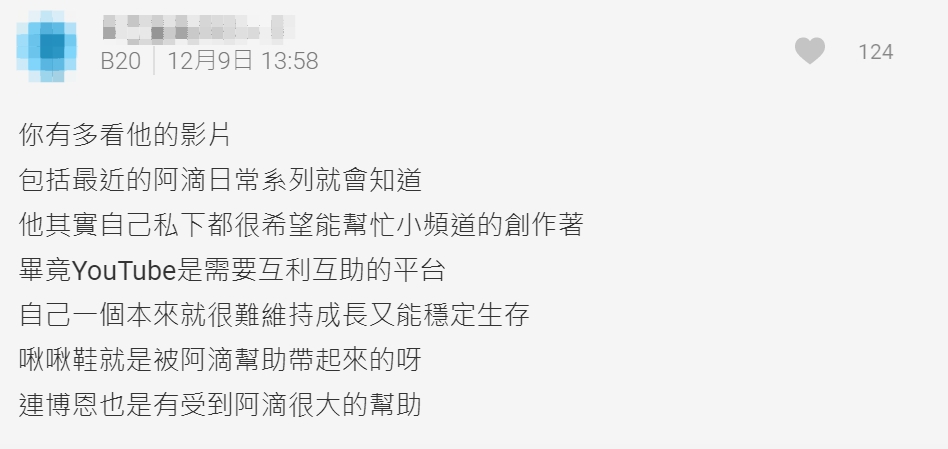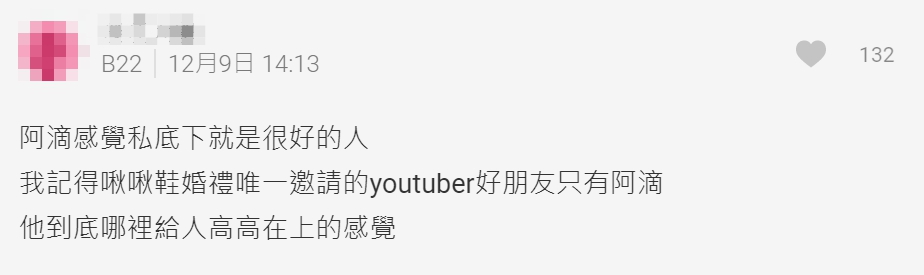 也有許多網友對阿滴與其他YouTuber之間的互動表達看法,「很認真在經營自己的頻道跟認識打交道同業,我覺得很好耶~」、「人家的個性就是喜歡交朋友吧?如果哪天阿滴來認識我我會很開心」、「滴超暖~從他一些日常的vlog就可以感覺的出來其他ytb都很喜歡他!而且在芬蘭vlog中幫嘟嘟處理行李的行為非常的用心~很喜歡這個老大哥!」、「阿滴感覺私底下就是很好的人,我記得啾啾鞋婚禮唯一邀請的youtuber好朋友只有阿滴」。