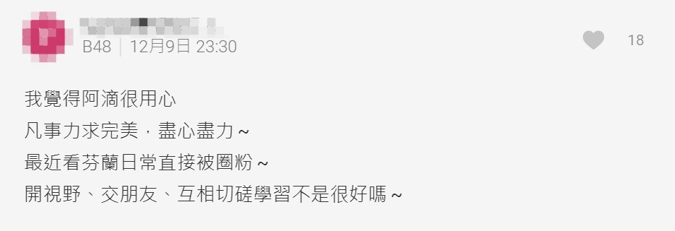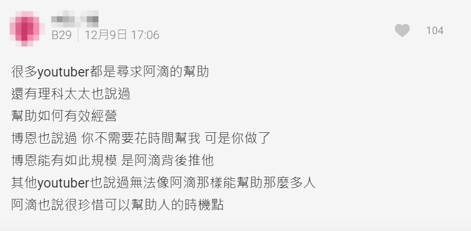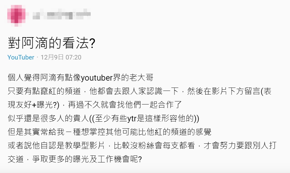 有網友近日在Dcard發文表示,阿滴有點像Youtuber界的老大哥,「只要有點竄紅的頻道,他都會去跟人家認識一下,然後在影片下方留言(表現友好+曝光?),再過不久就會找他們一起合作了」,除此之外似乎還是許多YouTuber的「貴人」,阿滴這樣的行為,讓該位網友覺得「一種想掌控其他可能比他紅的頻道的感覺」,原PO也猜測「或者說他自認是教學型影片,比較沒粉絲會每支都看,才會努力要跟別人打交道,爭取更多的曝光及工作機會呢?」
