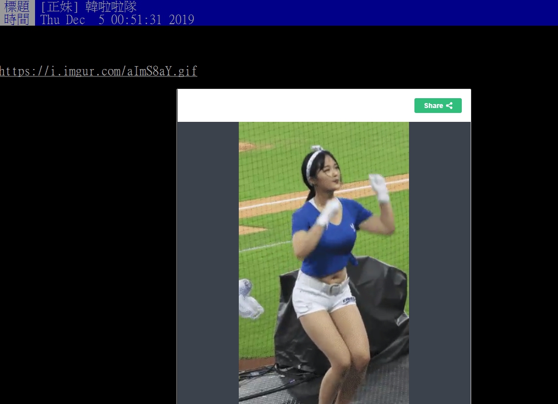 PTT自1999年創立,如今是全台灣人都愛用的論壇,在PTT上有著眾多不同類別的看板,其中「表特版」美女如雲,每天都會有許多鄉民貼出正妹照片或者是偶像美照!日前有網友貼出韓國啦啦隊隊員的動圖,只見女子跳舞時「超巨美胸」狂震,令人目不轉睛!