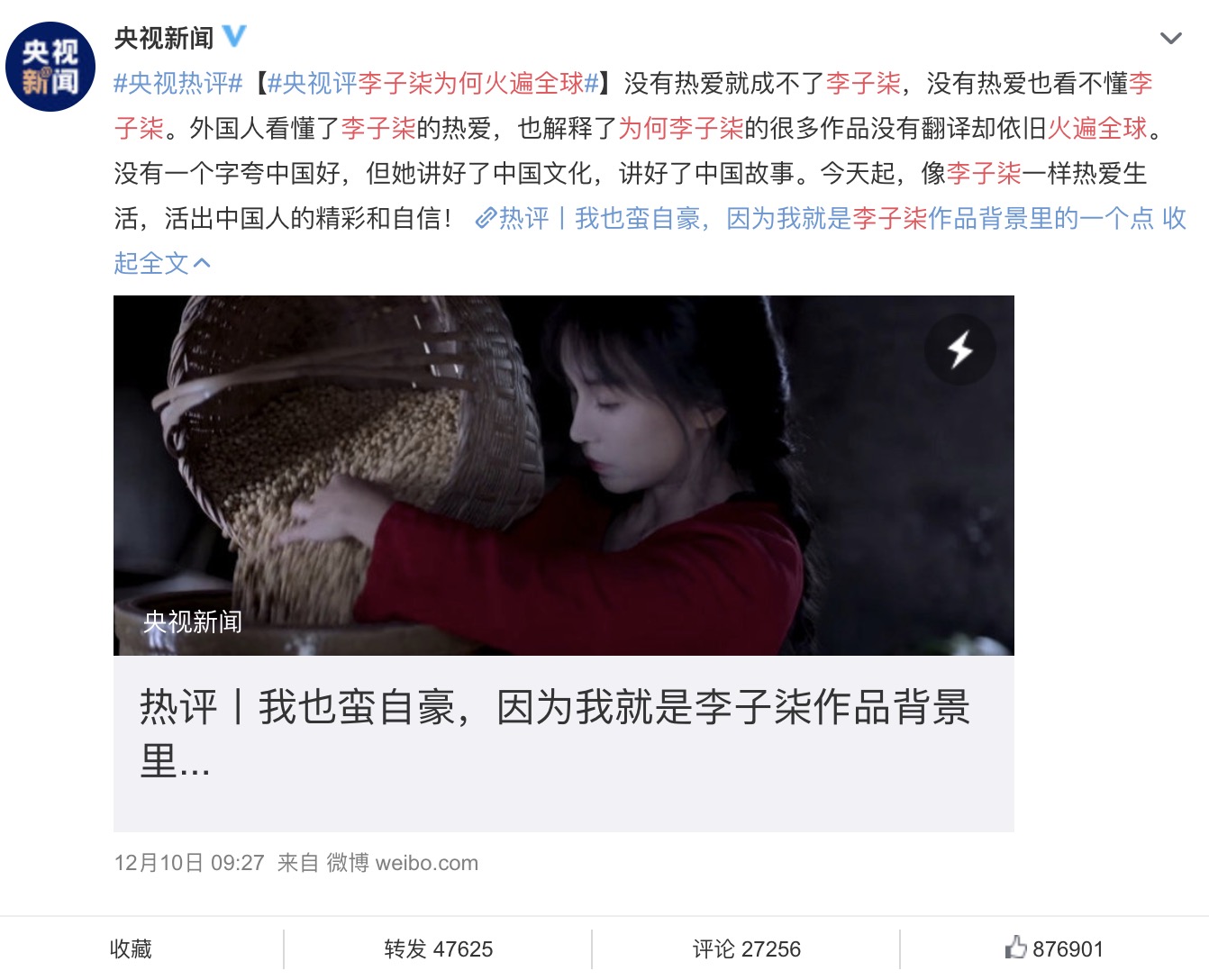 大陸千萬網紅「李子柒」過去因穿著古裝扮相分享料理心得、作品,透過實境及大自然的取景,而被稱為「穿越系網紅」,2017年更被稱為美食網紅第一人。過去李子柒也曾登上大陸節目中講述她相當勵志的故事,14歲時李子柒隻身前往大陸的大城市打拼,開始了長達八年的漂泊生活,如今成為千萬網紅後央視更寫了一篇文章點評「李子柒為何紅遍全球」,也因為央視的報導再次引發網友們的熱烈討論。