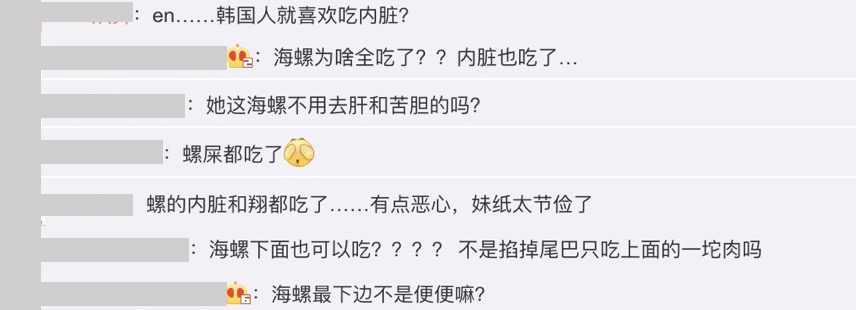 然而就有眼尖的網友發現HAMZY在吃海螺的時候似乎沒有將內臟挑起,甚至還有網友表示她連便便的地方都吃掉,紛紛留言說道:「海螺最下邊不是便便嘛?」、「海螺下面也可以吃???? 不是掐掉尾巴只吃上面的一坨肉嗎」、「螺的內臟都吃了……有點惡心,妹子太節儉了」、「韓國人就喜歡吃內臟?」,網友們對於HAMZY吃海螺沒有把內臟清出感到相當驚訝。