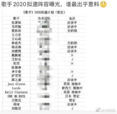 《歌手2020》也即將在明年播出,近日網路上曝光一份「擬邀名單」,眾多大咖歌手赫然在列,例如張惠妹、蔡依林、林俊傑、楊丞琳、田馥甄、艾怡良等,名單簡直超華麗!不過蔡依林和林俊傑的欄位已被寫上「無檔期」,但張惠妹、楊丞琳和田馥甄的欄位則是寫著「洽談中」,而艾怡良的欄位更是已被打勾,讓歌迷又驚又喜紛紛燃起希望,在網路上引發一波熱議。