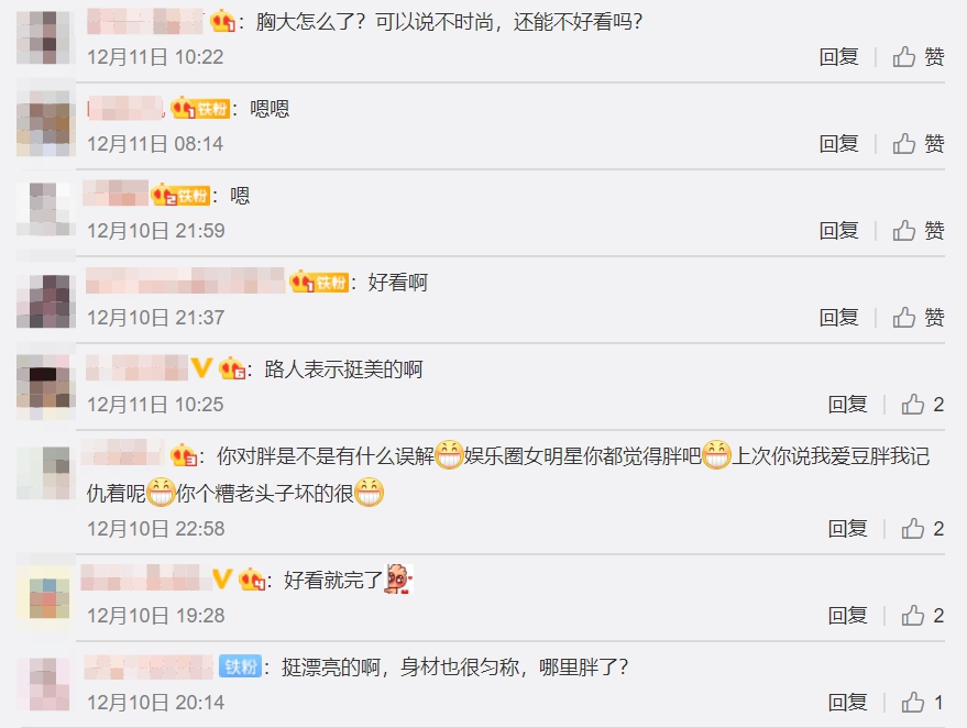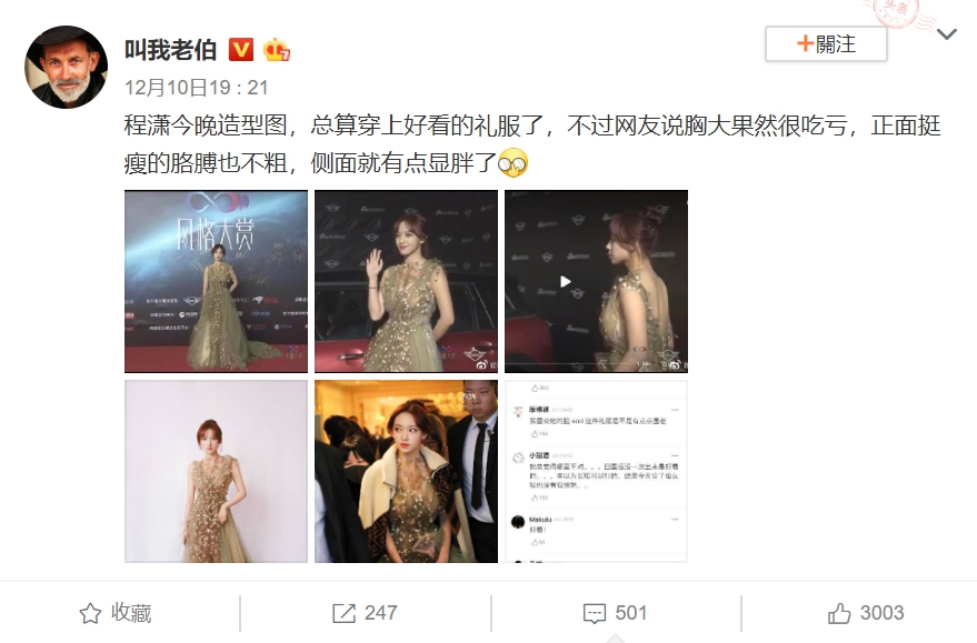 程瀟的造型也引起熱議,有網友留言「這裙子不適合她」、「胸大太吃虧了……」,不過也有大多數網友表示「這還胖??!!!你可以去量量眼睛度數了」、「胸大怎麼了?可以說不時尚,還能不好看嗎?」、「挺漂亮的啊,身材也很勻稱,哪裡胖了?」、「身材太好了」。