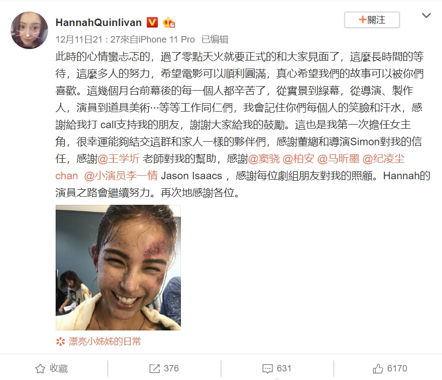 由昆凌所主演的災難電影「天火」最近上映了,她在前一天還發文透露自己對於新作品即將跟觀眾見面,內心非常的忐忑,還把導演、演員及所有工作人員都謝了一遍,配上一張帶著戲裡傷妝造型的自拍,隨後又特意發了一條微博「還是想謝謝你~」,雖然沒有提到名字,但網友們都馬上就想到應該是在謝謝她的老公周杰倫。