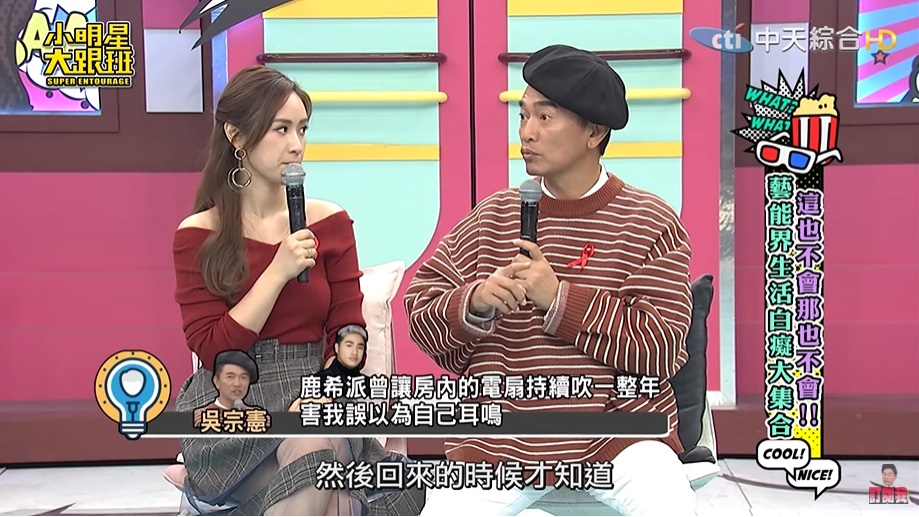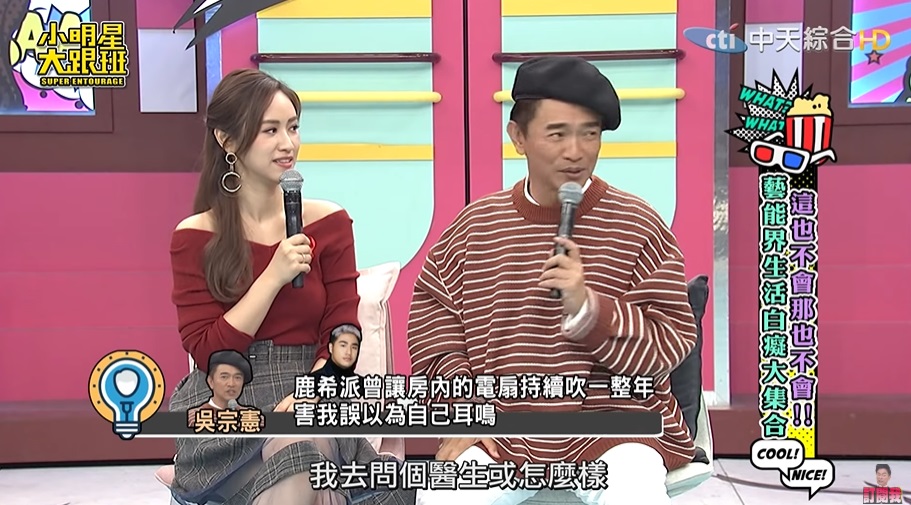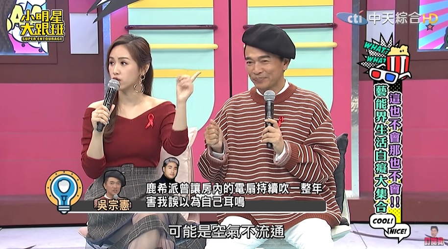最近吳宗憲在《小明星大跟班》中透露,鹿希派曾經讓房間裡面的電風扇持續開了一整年,讓他在家裡的時候,都會誤以為自己是不是有耳鳴的問題,甚至一度讓他緊張到是不是真的應該去看個醫生才好,可是當他一出門去錄影,就又發現他的耳鳴狀況有「改善」,直到某一次,他走得離兒子房間更靠近時,突然發現怎麼耳鳴的狀況變得特別嚴重,一仔細聽,終於找到「真兇」!